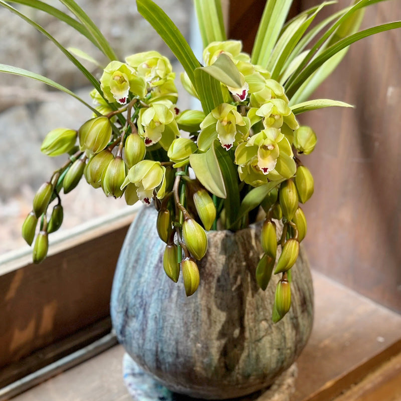 シックなシンビジウムを涙型のオシャレな陶器鉢に植えました。